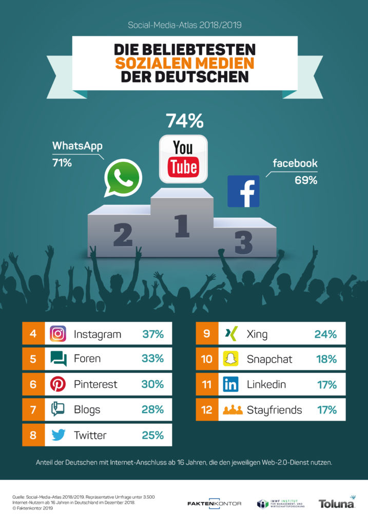 Eine ähnliche Tendenz beschreibt der aktuelle Social-Media-Atlas der Kommunikationsberatung Faktenkontor und des Marktforschers Toluna. Demnach ist Youtube das beliebteste Netzwerk in Deutschland (74 Prozent der Befragten nutzen die Plattform). Whatsapp (71 Prozent) hat Facebook (69 Prozent) erstmals überholt.